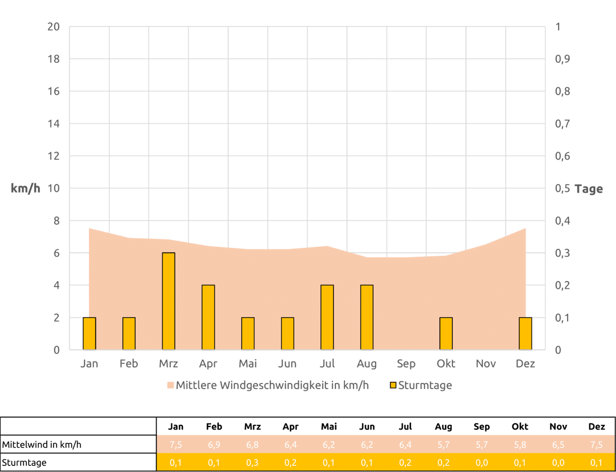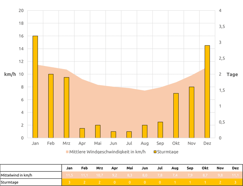 Klima Tiroler Oberland – Wind (20-jähriges Mittel) © Daten ZAMG – Grafik OBERLANDWetter Tal – 800m Berg ab 2800m