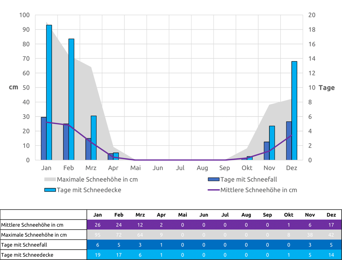 Klima Tiroler Oberland – Schnee (20-jähriges Mittel) © Daten ZAMG – Grafik OBERLANDWetter Tal – 800m Berg – 2800m
