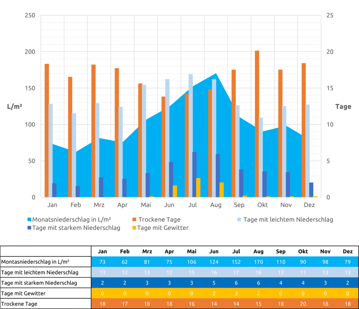 Klima Tiroler Oberland – Niederschlag (20-jähriges Mittel) © Daten ZAMG – Grafik OBERLANDWetter Tal – 800m Berg – 2800m